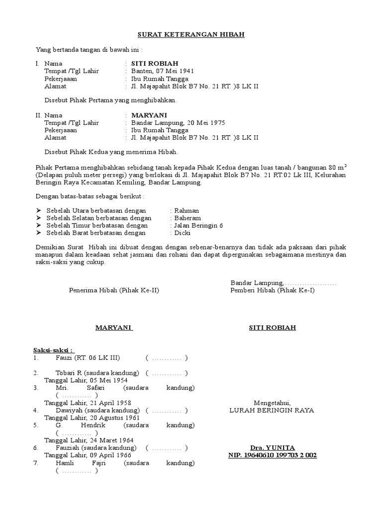 Banyak orang mengira bahwa hibah dan waris adalah dua hal yang sama. Akan tetapi didalam pemberian ini harus disertakan surat keterangan hibah tanah. Ibu 8 lk ii disebut pihak kedua yang menerima hibah. Dengan surat pernyataan penyerahan hak milik ini tentunya seseorang yang diberikan hibah akan memiliki hak penuh terhadap barang yang dihibahkan dan memiliki kekuatan hukum. Siti robiah tempat /tgl lahir :